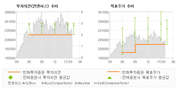 | 의견제시일자 | 증권사 | 투자의견 | 목표가 | | 20170428 | 한화투자증권 | HOLD(유지) | 220,000 | | 20170428 | 케이프투자증권 | 매수(유지) | 340,000 | | 20170428 | 동부증권 | HOLD(유지) | 260,000 | | 20170428 | 하이투자증권 | 매수(유지) | 325,000 |