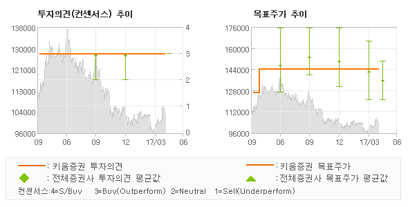 | 의견제시일자 | 증권사 | 투자의견 | 목표가 | | 20170428 | 삼성증권 | 매수 | 130,000 | | 20170428 | 케이프투자증권 | 매수(유지) | 135,000 | | 20170428 | 동부증권 | 매수(유지) | 145,000 | | 20170428 | 키움증권 | 매수(유지) | 144,000 |