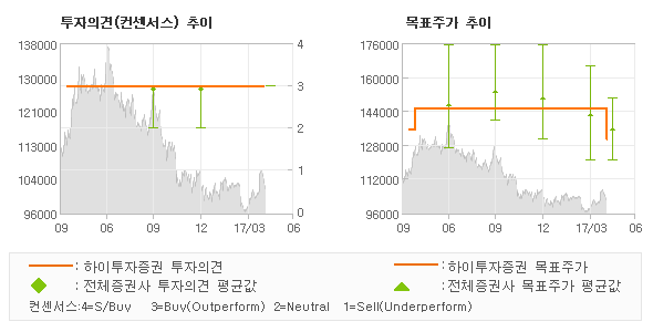 | 의견제시일자 | 증권사 | 투자의견 | 목표가 | | 20170428 | 삼성증권 | 매수 | 130,000 | | 20170428 | 케이프투자증권 | 매수(유지) | 135,000 | | 20170428 | 동부증권 | 매수(유지) | 145,000 | | 20170428 | 키움증권 | 매수(유지) | 144,000 |