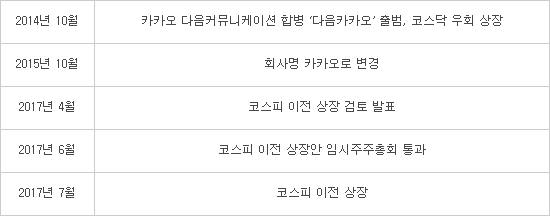 카카오가 코스피에 새로운 보금자리를 마련, 재도약을 다짐했다. 인공지능(AI), 스마트모빌리티(첨단운송) 등 신사업 추진을 위한 실탄 마련 작업이 탄력을 받을 전망이다. 2014년 다음커뮤니케이션과의 합병으로 코스닥에 입성한 지 3년 만이다. 다음과 합병 뒤 주춤하던 행보가 새 둥지에서 변화할 지 주목된다.