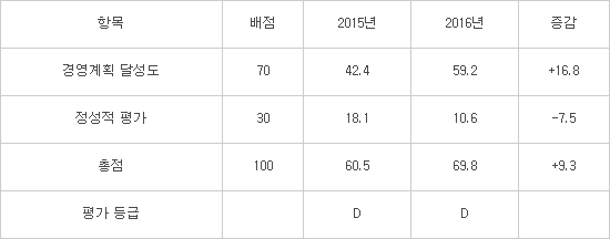 지난해에는 경영계획 달성도 59.2점에 정성평가 10.6점으로 기준점에 불과 0.2점 하회한 69.8점을 기록했다.