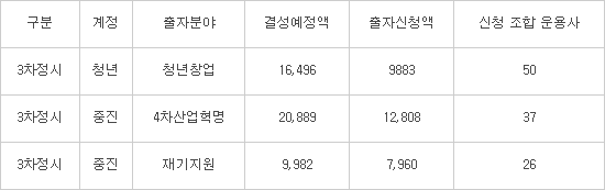 청년 계정인 청년 창업 분야에는 50개 조합 운용사가 신청했다. 출자금 신청 규모는 9883억원으로, 1조원에 육박했다. 정부출자금(3300억원) 3배에 가까운 수치다.