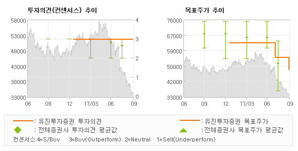 오늘 유진투자증권에서 발표된 '매수(유지)'의견 및 목표주가 48,000원은 전체 컨센서스 대비해서 조금더 긍정적인 수준으로 풀이되며 목표가평균과 대비해서 미미한 차이가 나는 것으로 집계되었다. 참고로 최근에 목표주가를 가장 공격적으로 제시한 한국투자증권에서 투자의견 '매수(유지)'에 목표주가 60,000원을 제일 보수적인 의견을 제시한 한화투자증권에서 투자의견 'HOLD(유지)'에 목표주가 36,000원을 제시한 바 있다.
