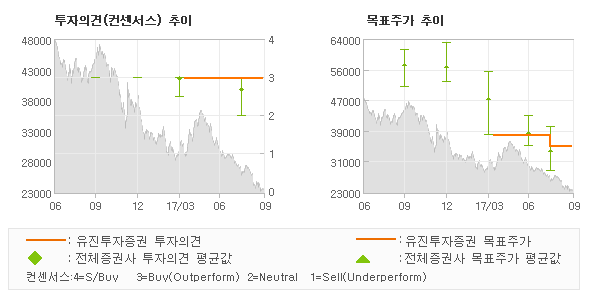 | 의견제시일자 | 투자의견 | 목표가격 | | 20170929 | 매수(유지) | 35,000 | | 20170814 | 매수(유지) | 35,000 | | 20170626 | 매수(유지) | 38,000 | | 20170613 | 매수(유지) | 38,000 | | 20170522 | 매수(유지) | 38,000 |