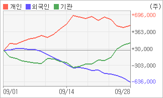 | 기관/개인 순매수, 외국인은 순매도(한달누적) 기관이 4일연속 순매수를 보이고 있는 반면에 외국인은 5일연속 순매도를 보이고 있다. 4주간을 기준으로 보면 기관이 순매도를 기록하다가 다시 순매수로 돌아서면서 146,242주를 순매수했고, 개인들도 매기를 떨어뜨리면서도 489,140주를 순매수했다. 반면 그 동안 외국인은 매도 우위를 지속하면서 635,382주를 순매도했다. |