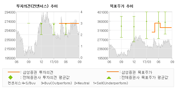 | 의견제시일자 | 증권사 | 투자의견 | 목표가 | | 20170929 | 삼성증권 | 매수 | 330,000 | | 20170928 | IBK투자증권 | 매수(유지) | 320,000 | | 20170925 | NH투자증권 | 매수(유지) | 400,000 | | 20170919 | 신영증권 | 매수(신규) | 370,000 |