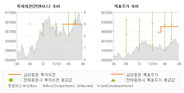 | 의견제시일자 | 증권사 | 투자의견 | 목표가 | | 20170929 | 삼성증권 | 매수 | 500,000 | | 20170927 | 동부증권 | 매수(유지) | 550,000 | | 20170927 | SK증권 | 매수(유지) | 410,000 | | 20170925 | NH투자증권 | 매수(유지) | 550,000 |