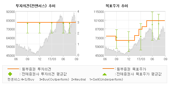| 의견제시일자 | 증권사 | 투자의견 | 목표가 | | 20170929 | 동부증권 | 매수(유지) | 100,000 | | 20170929 | 유진투자증권 | 매수(유지) | 110,000 | | 20170927 | 흥국증권 | 매수 | 100,000 | | 20170927 | 신한금융투자 | 매수(유지) | 105,000 |