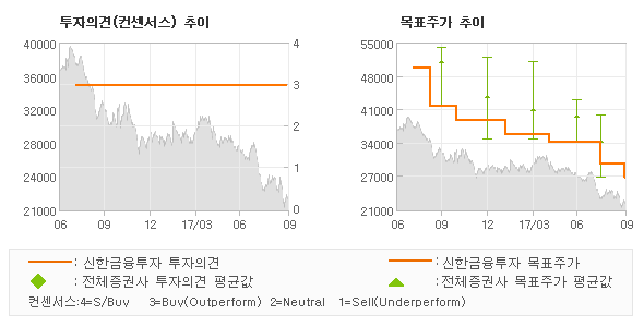 신한금융투자의 동종목에 대한 최근 1년동안의 투자의견은 전체적으로 큰 변화없이 유지되고 있다. 목표주가는 2016년9월 42,000원까지 높아졌다가 2017년8월 30,000원을 최저점으로 목표가가 제시된 이후 최근에 27,000원으로 새롭게 조정되고 있다.