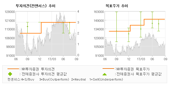 | 의견제시일자 | 증권사 | 투자의견 | 목표가 | | 20170929 | NH투자증권 | 매수(유지) | 150,000 | | 20170914 | 하나금융투자 | 매수 | 140,000 | | 20170912 | 하이투자증권 | 매수(유지) | 140,000 | | 20170911 | IBK투자증권 | 매수(신규) | 140,000 |