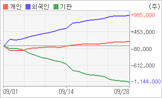| 외국인/개인 순매수, 기관은 순매도(한달누적) 9월5일부터 기관이 18거래일 연속 순매도 행진을 벌이고 있다. 4주간을 기준으로 보면 외국인이 초반에 동종목을 순매수한 이후에 기세를 이어가며 984,769주를 순매수했고, 개인들도 순매수량을 늘리며 158,481주를 순매수했다. 하지만 기관은 매도 관점으로 접근하면서 1,143,250주를 순매도했다. |