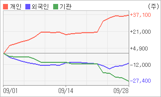 | 외국인과 기관은 순매도, 개인은 순매수(한달누적) 기관이 5일연속 주식을 팔고 있는 반면 외국인은 3일연속 주식을 사고 있다. 4주간을 기준으로 보면 외국인이 매도 우위를 지속하면서 9,671주를 순매도했고, 기관도 매도 관점으로 접근하면서 27,379주를 순매도했지만, 개인은 오히려 순매수량을 늘리며 37,050주를 순매수했다. |