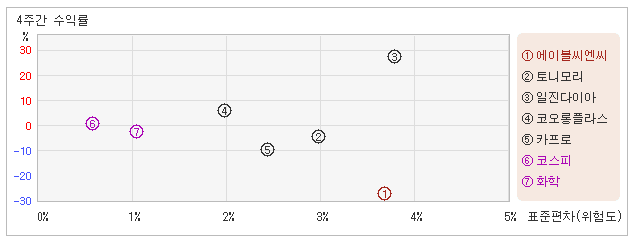 | 관련종목들 가운데 변동폭 커도 수익율은 낮아 29일 오후 1시10분 현재 전일대비 3.63% 오른 15,700원을 기록하고 있는 에이블씨엔씨는 지난 1개월간 27.82% 하락했다. 같은 기간동안 변동성의 크기를 말해주는 표준편차는 3.6%를 기록했다. 이는 코스피 업종내에서 주요종목들과 비교해볼 때 에이블씨엔씨의 월간 변동성이 상대적으로 커짐과 함께 주가도 마이너스를 보이며 낮은 수준을 유지했다는 뜻이다. 최근 1개월을 기준으로 에이블씨엔씨의 위험을 고려한 수익률은 -7.7을 기록했는데, 변동성이 높고 주가는 약세를 기록하면서 위험대비 수익률은 가장 저조한 모습을 보였다. 게다가 코스피업종의 위험대비수익률 2.2보다도 낮기 때문에 업종대비 성과도 좋지 않았다고 할 수 있다. 다음으로 업종과 시장을 비교해보면 에이블씨엔씨가 속해 있는 코스피업종은 화학지수보다 변동성은 낮고, 수익률은 높은 모습을 보여주고 있다. 따라서 코스피업종에 투자하고 있다면 지수대비 안전하면서도 높은 상승률을 기록하고 있는 것이다. |