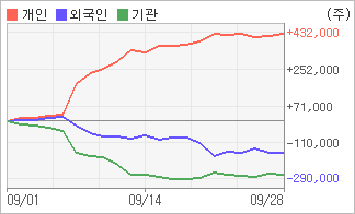 | 외국인과 기관은 순매도, 개인은 순매수(한달누적) 9월27일부터 전일까지 외국인이 2거래일 연속 순매도했다. 4주간을 기준으로 보면 외국인이 매도 우위를 지속하면서 160,605주를 순매도했고, 기관도 매도 우위를 보이면서 267,144주를 순매도했지만, 개인은 오히려 순매수량을 늘리며 427,749주를 순매수했다. |