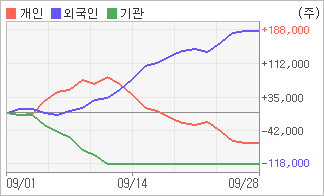| 기관과 개인은 순매도, 외국인은 순매수(한달누적) 9월25일부터 전일까지 외국인이 4거래일 연속 순매수를 보였다. 4주간을 기준으로 보면 외국인이 초반에 동종목을 순매수한 이후에 기세를 이어가며 187,510주를 순매수한 반면, 기관은 매도 우위를 보이면서 117,916주를 순매도했고, 개인들도 매도 우위로 반전되면서 69,594주를 순매도한 것으로 집계됐다. |