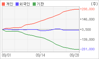 | 외국인과 기관은 순매도, 개인은 순매수(한달누적) 전일 기관이 2,910주를 순매수했고, 외국인은 531주를 순매도했다. 4주간을 기준으로 보면 외국인이 매도 후 매수의 관점을 보이고 있음에도 불구하고 7,081주를 순매도했고, 기관도 매도 관점으로 접근하면서 277,756주를 순매도했지만, 개인은 오히려 순매수량을 늘리며 284,837주를 순매수했다. |