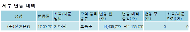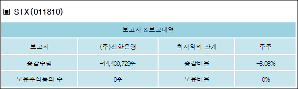 STX(011810)는 29일 주주 (주)신한은행의 보유주식이 14,436,729주 감소하여 지분율은 0%로 하락했다. 이번 보고 사유는 대표보고자(한국산업은행)의연명공시에 따른 기보고보유지분율에대한변동보고(주)STX제13차채권금융기관협의회안건결의및매각여건점검후매각추진승인(#17.9.27자)에 따른 채권단보유지분공동매각추진공시로 알려졌다.