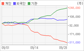| 외국인/기관 순매수, 개인은 순매도(한달누적) 9월18일부터 기관이 9거래일 연속 순매수 행진을 벌이고 있다. 4주간을 기준으로 보면 외국인이 매수 우위를 유지하면서 63,203주를 순매수했고, 기관도 방향성있는 매매를 하면서 247,647주를 순매수했다. 반면 개인들은 매도쪽으로 방향을 잡으면서 310,850주를 순매도한 것으로 나타났다. |