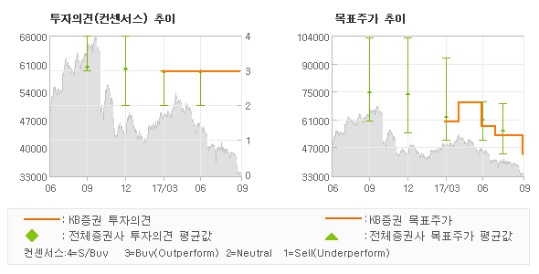 | 의견제시일자 | 증권사 | 투자의견 | 목표가 | | 20170929 | KB증권 | 매수(유지) | 43,000 | | 20170911 | 한화투자증권 | 매수(유지) | 55,000 | | 20170901 | 미래에셋대우 | 매수(유지) | 57,000 | | 20170828 | 흥국증권 | 매수(유지) | 57,000 |