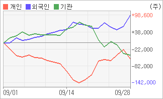 | 기관과 개인은 순매도, 외국인은 순매수(한달누적) 기관이 3일연속 주식을 팔고 있는 반면 외국인은 2일연속 주식을 사고 있다. 4주간을 기준으로 보면 외국인이 초반에 동종목을 순매수한 이후에 기세를 이어가며 98,550주를 순매수한 반면, 기관은 순매수에서 순매도로 반전되면서 43,009주를 순매도했고, 개인들도 초반에 동종목을 순매도한 이후에 근래에는 순매도량을 줄이면서 55,541주를 순매도한 것으로 집계됐다. |