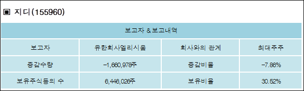 지디(155960)는 29일 최대주주 유한회사엘리시움의 보유주식이 증가되었다고 발표했다. 이는 직전 보고일보다 1,660,978주 감소하여 지분율은 30.52%로 하락했다. 이번 보고 사유는 주식장내매도및주식등담보계약체결으로 알려졌다.