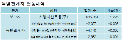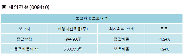 태영건설(009410)은 29일 주주 신영자산운용(주)를 비롯한 특별관계자의 보유주식이 감소되었다고 발표했다. 이는 직전 보고일보다 944,908주 감소하여 지분율은 7.24%로 하락했다. 이번 보고 사유는 1%이상변동으로 알려졌다.