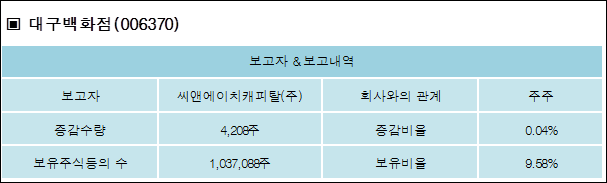 대구백화점(006370)은 29일 주주 씨앤에이치캐피탈(주)를 비롯한 특별관계자의 보유주식이 증가되었다고 발표했다. 이는 직전 보고일보다 4,208주 증가하여 지분율은 9.58%로 상승했다. 이번 보고 사유는 주식매수로 알려졌다.