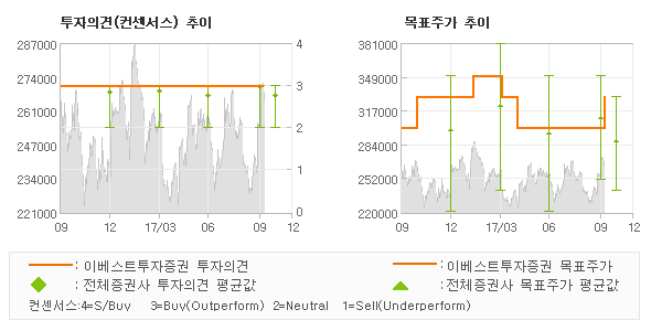 | 의견제시일자 | 증권사 | 투자의견 | 목표가 | | 20171013 | 이베스트투자증권 | 매수(유지) | 330,000 | | 20171012 | 유진투자증권 | HOLD(유지) | 240,000 | | 20171011 | 메리츠종금증권 | 매수 | 295,000 | | 20171011 | 하나금융투자 | 매수 | 280,000 |
