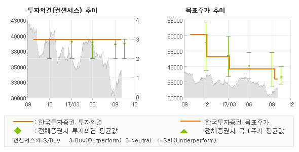 한국투자증권의 동종목에 대한 최근 1년동안의 투자의견은 전체적으로 큰 변화없이 유지되고 있다. 목표주가는 2016년10월 61,000원까지 높아졌다가 2017년10월 39,000원을 최저점으로 목표가가 제시된 이후 최근에도 39,000원으로 제시되고 있다. |