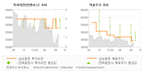 | 의견제시일자 | 증권사 | 투자의견 | 목표가 | | 20171030 | 삼성증권 | HOLD | 36,000 | | 20171030 | 미래에셋대우 | TRADING BUY(유지) | 38,000 | | 20171030 | KB증권 | 매수(유지) | 45,000 | | 20171023 | SK증권 | 매수(유지) | 43,000 |