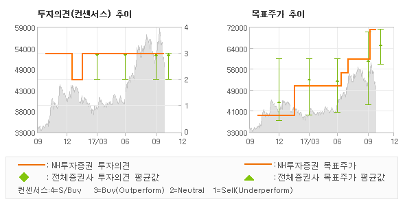 | 의견제시일자 | 증권사 | 투자의견 | 목표가 | | 20171030 | NH투자증권 | 매수(유지) | 71,000 | | 20171030 | 신한금융투자 | 매수(유지) | 60,000 | | 20171030 | 하나금융투자 | 매수 | 69,000 | | 20171030 | 유진투자증권 | 매수(유지) | 61,000 |
