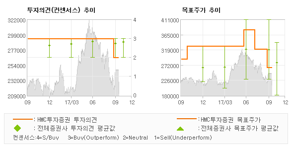 | 의견제시일자 | 증권사 | 투자의견 | 목표가 | | 20171030 | HMC투자증권 | MARKETPERFORM | 265,000 | | 20171030 | SK증권 | 매수(유지) | 340,000 | | 20171030 | 한국투자증권 | 매수(유지) | 270,000 | | 20171030 | 신영증권 | 매수 | 250,000 |