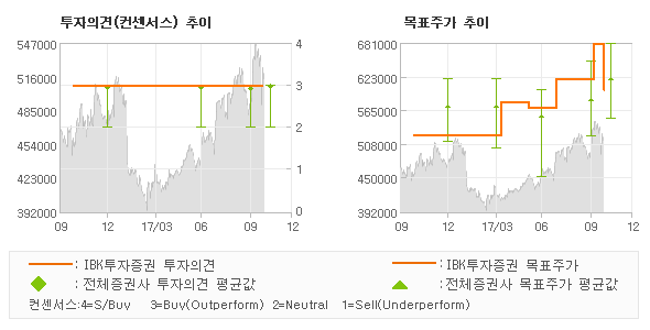 IBK투자증권의 동종목에 대한 최근 1년동안의 투자의견은 전체적으로 큰 변화없이 유지되고 있다. 목표주가는 2016년10월 522,000원이 저점으로 제시된 이후 2017년10월 680,000원을 최고점으로 목표가가 제시되었고 최근에는 600,000원으로 다소 하향조정되고 있다. |