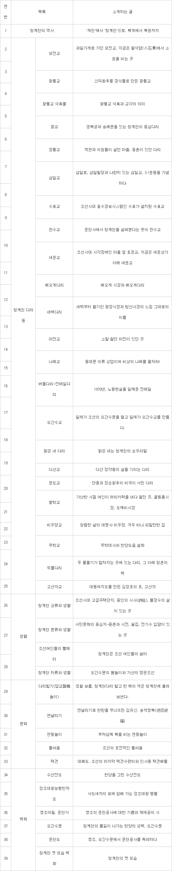 이 서비스는 청계천의 다리, 생활, 문화, 벽화 등 39개 콘텐츠로 구성됐다. 서울시는 청계천 역사문화 콘텐츠는 학술 기준으로 일일이 고증했다. 이야기 전달 방식으로 청계천을 찾는 시민이나 관광객 모두 쉽게 이해할 수 있도록 설계했다. 한국어를 비롯해 영어와 중어, 일어를 포함한 총 4개 언어를 지원한다.