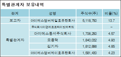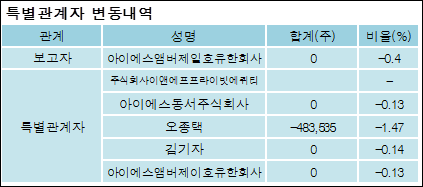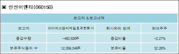 인선이엔티(060150)는 30일 최대주주 아이에스앰버제일호유한회사를 비롯한 특별관계자의 보유주식이 감소되었다고 발표했다. 이는 직전 보고일보다 483,535주 감소하여 지분율은 32.28%로 하락했다. 이번 보고 사유는 특별관계자의장내매도로 알려졌다.