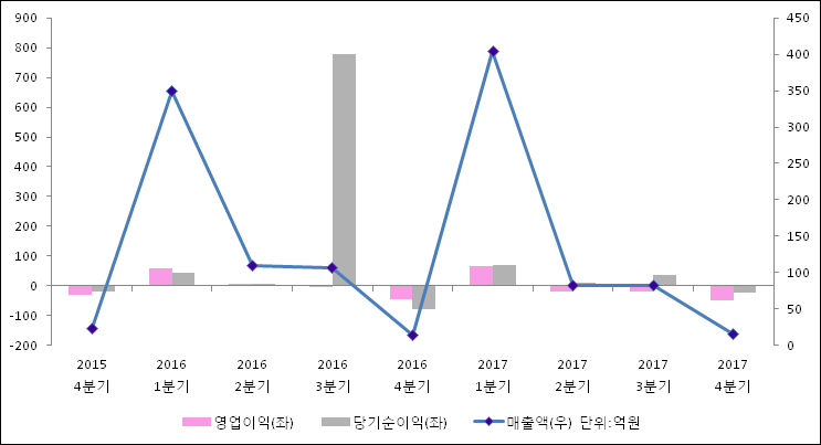 02월 02일 성보화학(003080)의 2017년 4분기 개별 잠정_대량변동 실적이 발표됐다. 작년 같은 기간 대비해서 매출액은 15% 상승하여 16억원을 기록했다. 영업이익은 -48.6억원으로 -46억원에서 적자폭이 확대되었다. 당기순이익은 -78억원에서-21.4억원으로 적자축소되었다고 발표했다.