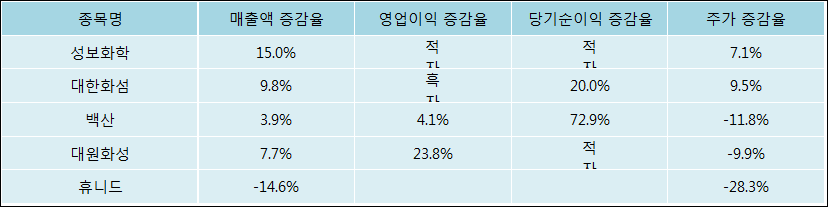 다음은 성보화학과 동일 업종 내 비교 그룹 종목의 각각 최근 실적의 전년 동기 대비 성장률이다. 성보화학의 매출액 증감율은 타 종목 대비 가장 우수한 편이다. 그리고 주가 상승률은 높은 편이다.