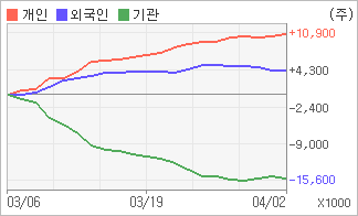 | 외국인/개인 순매수, 기관은 순매도(한달누적) 3월27일부터 전일까지 외국인이 5거래일 연속 동종목을 내다 팔았다. 4주간을 기준으로 보면 외국인이 초반에 동종목을 순매수한 이후에 기세를 이어가며 4,220,722주를 순매수했고, 개인들도 순매수량을 늘리며 10,868,401주를 순매수했다. 하지만 기관은 매도 관점으로 접근하면서 15,089,123주를 순매도했다. |