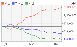 | 외국인과 기관은 순매도, 개인은 순매수(한달누적) 전일까지 외국인이 4일 연속, 기관이 2일 연속 각각 동종목을 순매도 했다. 4주간을 기준으로 보면 외국인이 매도 우위를 지속하면서 740,614주를 순매도했고, 기관도 매도 관점으로 접근하면서 1,407,887주를 순매도했지만, 개인은 오히려 순매수량을 늘리며 2,148,501주를 순매수했다. |