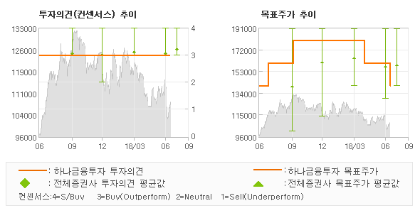 하나금융투자의 동종목에 대한 최근 1년동안의 투자의견은 전체적으로 큰 변화없이 유지되고 있다. 목표주가는 한때 2017년10월 180,000원을 최고점으로 기록된 이후 최근에 140,000원 수준까지 다소 하향조정되고 있다. |
