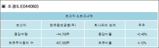 조광ILI(044060)는 10일 주주 한국증권금융(주)의 보유주식이 증가되었다고 발표했다. 이는 직전 보고일보다 44,700주 감소하여 지분율은 4.12%로 하락했다. 이번 보고 사유는 신용공여에 따른 담보권신규취득및변동으로 알려졌다.