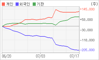 | 기관/개인 순매수, 외국인은 순매도(한달누적) 7월3일부터 외국인들이 11거래일 연속 순매도 행진을 벌이고 있다. 4주간을 기준으로 보면 기관이 방향성있는 매매를 하면서 80,327주를 순매수했고, 개인들도 순매수량을 늘리며 124,305주를 순매수했다. 반면 그 동안 외국인은 매도 우위를 지속하면서 204,632주를 순매도했다. |