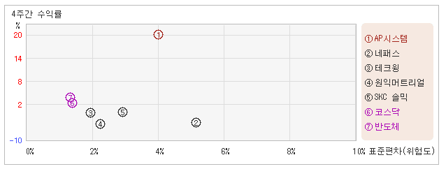 | 관련종목들 가운데 변동폭 작아도 수익율은 높아 18일 오후 1시25분 현재 전일대비 6.67% 오른 24,800원을 기록하고 있는 AP시스템은 지난 1개월간 20.39% 상승했다. 같은 기간동안에 위험정도를 말해주는 표준편차는 4%를 기록했다. 이는 반도체 업종내에서 주요종목들과 비교해볼 때 AP시스템의 월간 주가수익률이 가장 높았던 만큼 변동성도 상당히 높은 수준을 유지했다는 뜻이다. 최근 1개월을 기준으로 AP시스템의 위험을 고려한 수익률은 5.0을 기록했는데, 변동성은 높았으나 주가수익률이 양호했기 때문에 위험대비 수익률도 높은 수준을 나타냈다. 뿐만아니라 반도체업종의 위험대비수익률인 1.6보다도 높기 때문에 업종대비 성과도 좋았다고 할 수 있다. 다음으로 업종과 시장을 비교해보면 AP시스템이 속해 있는 반도체업종은 코스닥지수보다 변동성과 수익률이 모두 높은 모습이다. 다시 말하면 동업종에 탄력이 붙으면서 지수대비 초과상승했다는 의미이다. |