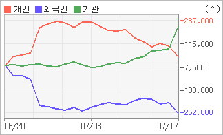 | 기관/개인 순매수, 외국인은 순매도(한달누적) 7월10일부터 전일까지 기관이 6거래일 연속 동종목을 사들였다. 4주간을 기준으로 보면 기관이 순매도를 기록하다가 다시 순매수로 돌아서면서 204,618주를 순매수했고, 개인들도 매기를 떨어뜨리면서도 47,354주를 순매수했다. 반면 그 동안 외국인은 매도 우위를 지속하면서 251,972주를 순매도했다. |