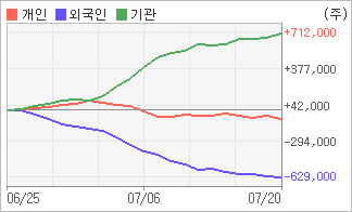| 외국인과 개인은 순매도, 기관은 순매수(한달누적) 기관이 5일연속 순매수를 보이고 있는 반면에 외국인은 2일연속 순매도를 보이고 있다. 4주간을 기준으로 보면 기관이 방향성있는 매매를 하면서 711,645주를 순매수한 반면, 외국인은 매도 우위를 지속하면서 628,059주를 순매도했고, 개인들도 매도쪽으로 방향을 잡으면서 83,586주를 순매도했다. |