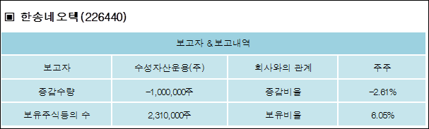 한송네오텍(226440)은 08일 주주 수성자산운용(주)의 보유주식이 감소되었다고 발표했다. 이는 직전 보고일보다 1,000,000주 감소하여 지분율은 6.05%로 하락했다. 이번 보고 사유는 장내매도에의한변동보고로 알려졌다.