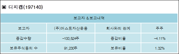 디지캡(197140)은 06일 주주 (주)머스트자산운용의 보유주식이 감소되었다고 발표했다. 이는 직전 보고일보다 100,524주 감소하여 지분율은 1.32%로 하락했다. 이번 보고 사유는 1%이상변동보고로 알려졌다.