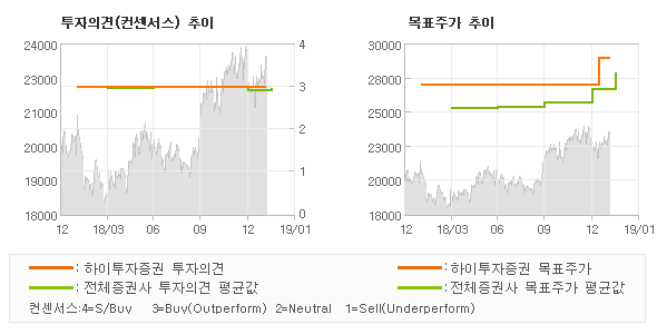| 의견제시일자 | 증권사 | 투자의견 | 목표가 | | 20190201 | 하이투자증권 | BUY (MAINTAIN) | 29,000 | | 20190201 | 한화투자증권 | BUY(유지) | 27,000 | | 20190116 | 대신증권 | BUY | 29,000 | | 20190111 | KB증권 | BUY(유지) | 28,000 |