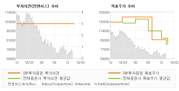 IBK투자증권의 동종목에 대한 최근 1년동안의 투자의견은 전체적으로 큰 변화없이 유지되고 있다. 목표주가는 2018년3월 140,000원까지 높아졌다가 2018년10월 95,000원을 최저점으로 목표가가 제시된 이후 최근에 85,000원으로 새롭게 조정되고 있다. |