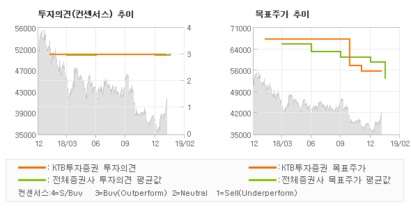 | 의견제시일자 | 증권사 | 투자의견 | 목표가 | | 20190201 | KTB투자증권 | BUY | 56,000 | | 20190201 | KB증권 | BUY(유지) | 50,000 | | 20190201 | IBK투자증권 | 매수(유지) | 58,000 | | 20190201 | DB금융투자 | BUY(유지) | 59,000 |